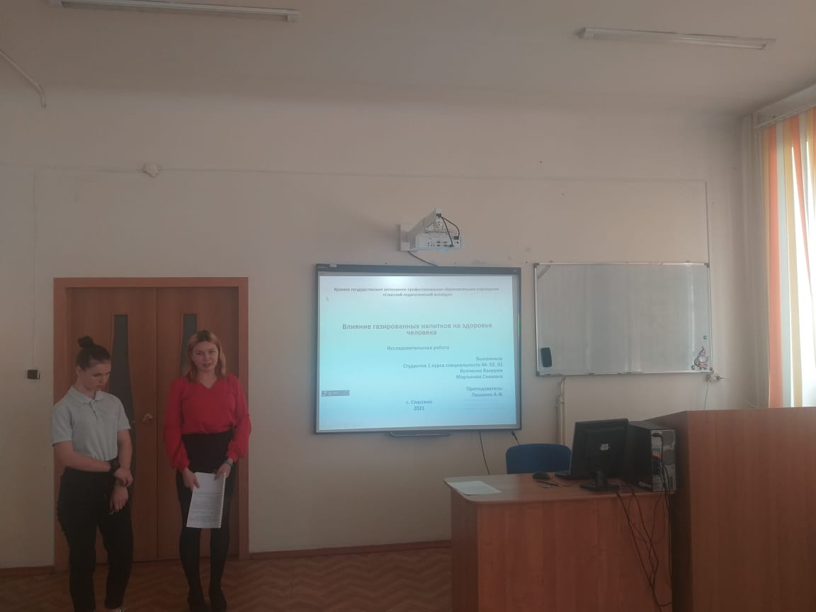 - Мартынюк Снежана, Волченко Валерия, студентки 1 курса группы «Б» специальности 44.02.02 Преподавание в начальных классах. Тема выступления: «Влияние газированных напитков на организм человека».